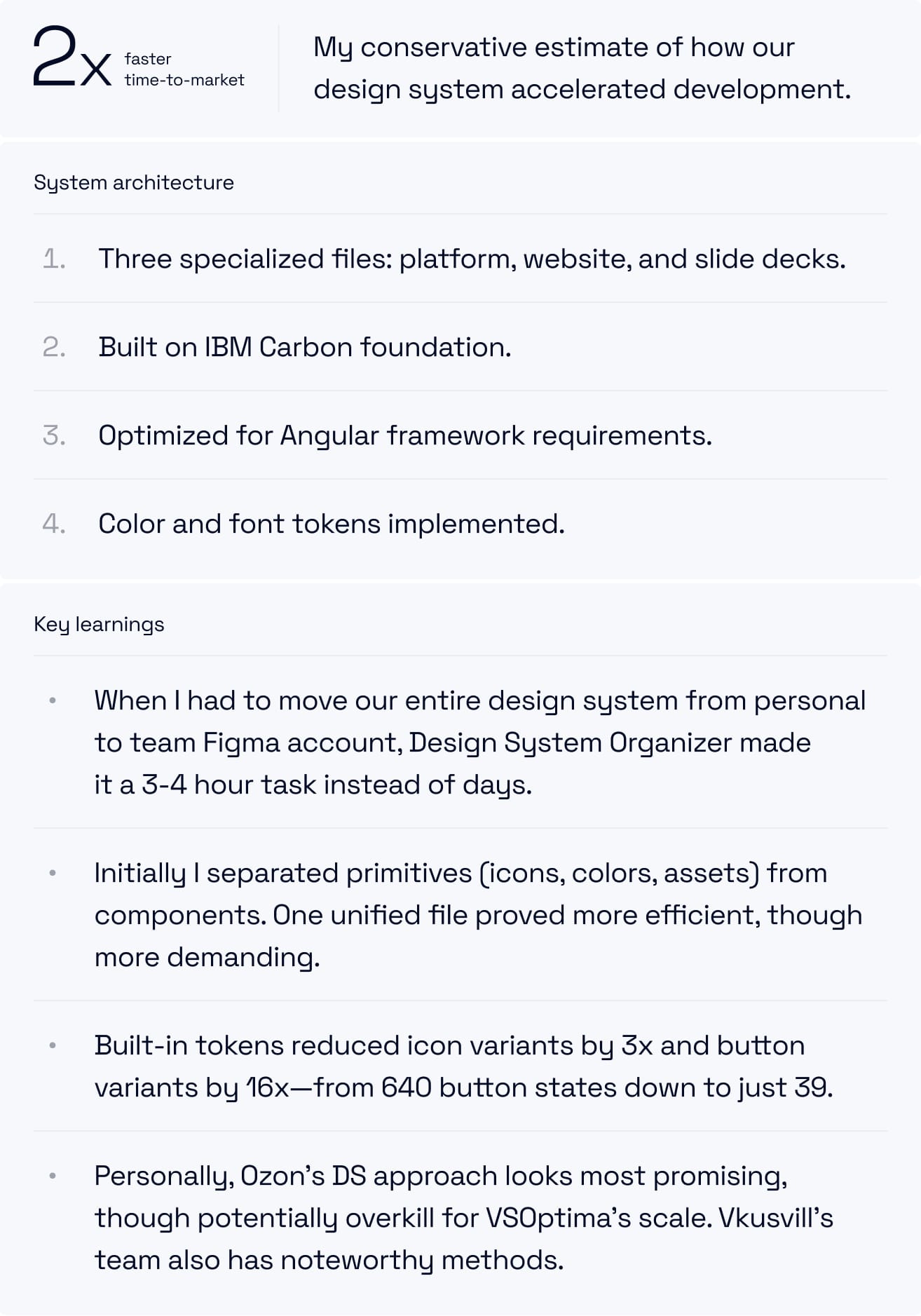 I can't ignore sharing one of the biggest impacts of design system adoption, especially tokens. Long story short: I managed to compress ~640 button states down to 39—that's 16x fewer variants. Results: