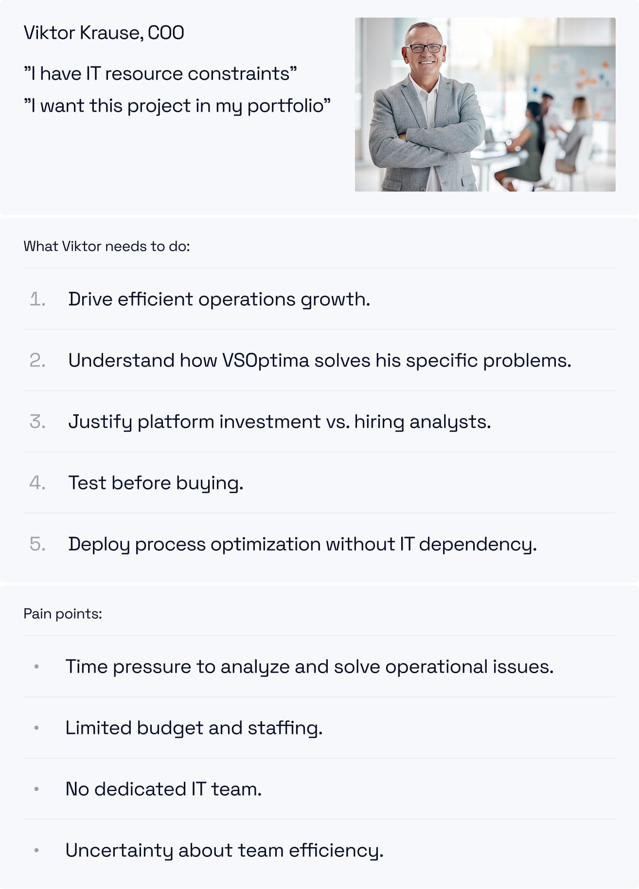 We created and continuously update personas based on extensive interviews. While client organizations vary in size and industry, we focus on 3 core roles.